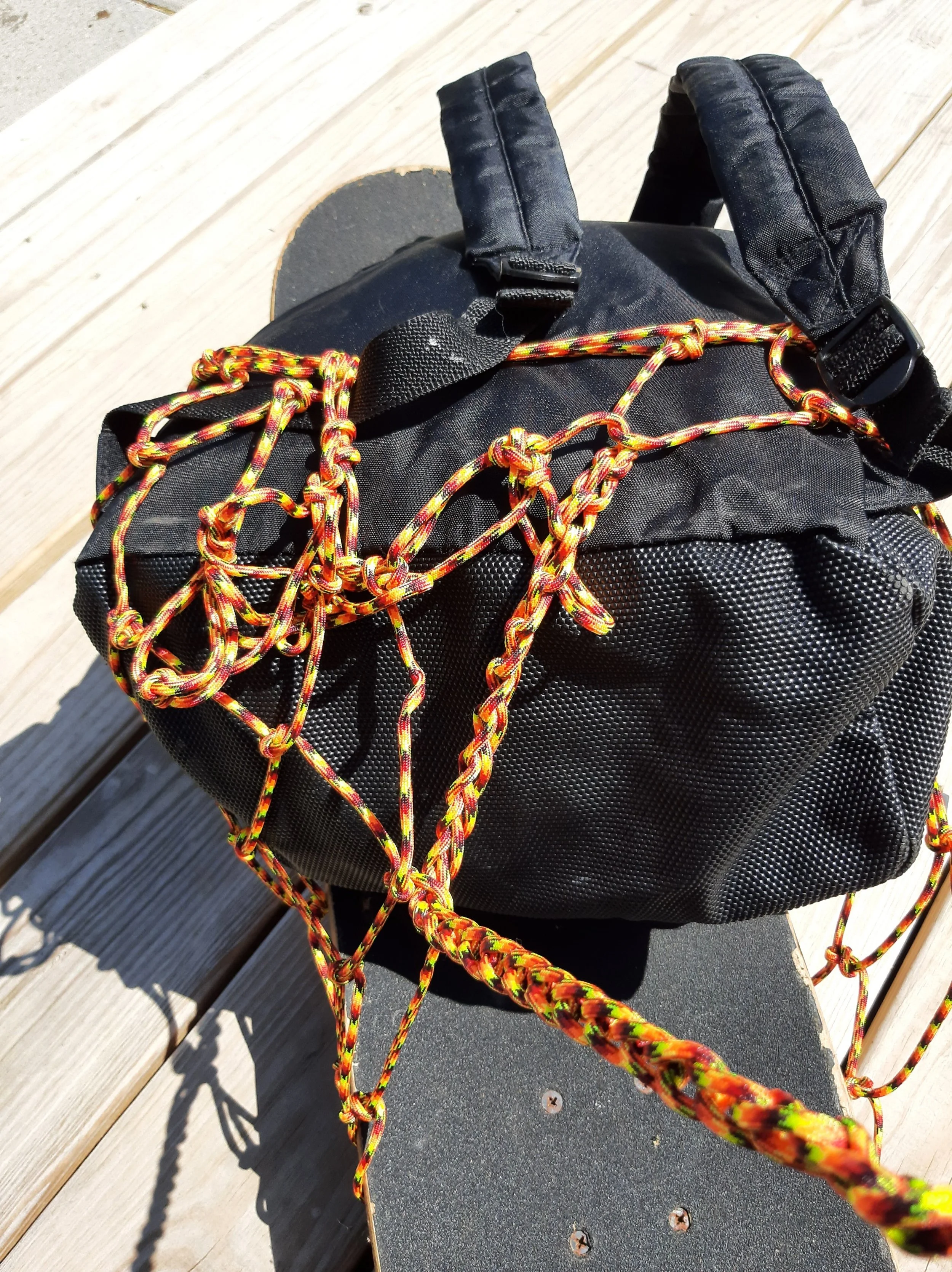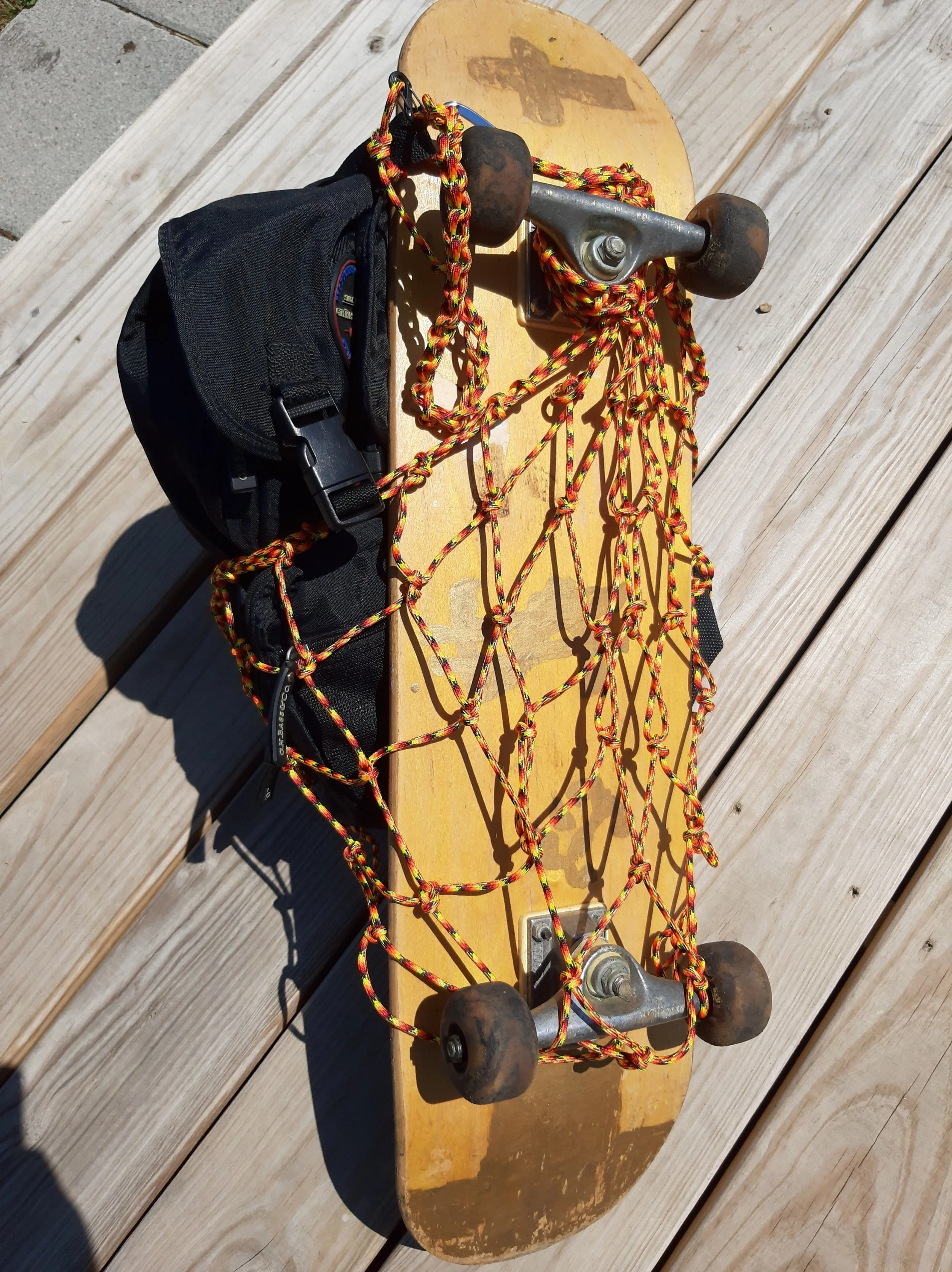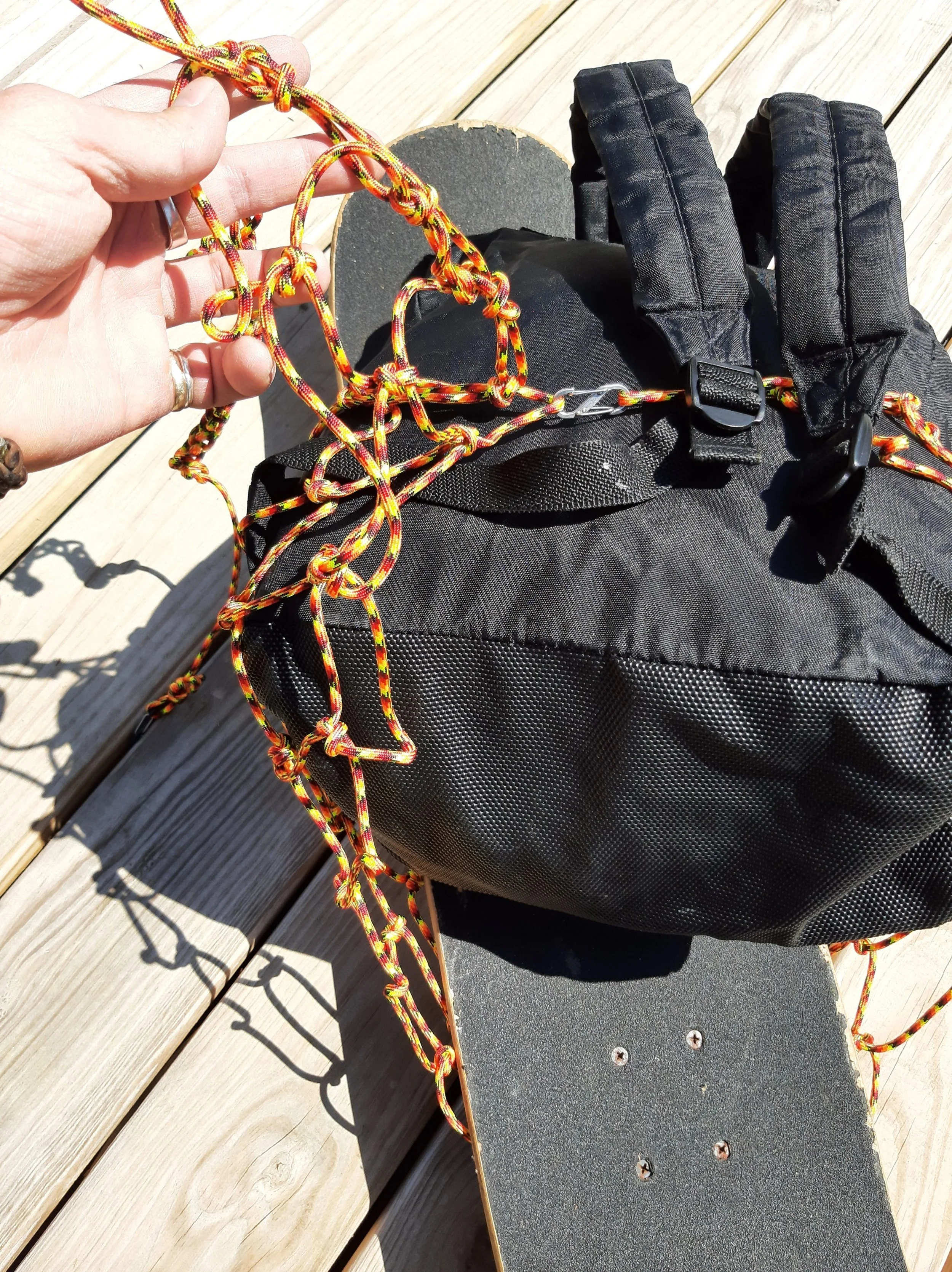 OK, the fixed end is clipped now. We take the long tail to weave thru a mesh on the bottom and come up and around the fixed end, grab a mesh, and repeat, joining both ends, keep in mind your skateboard is going to hang lower, and we are weaving around it. It’s supported by the wheels poking thru the mesh on the other side. Undo the long tail daisy chain if you need more tail to wrap cinch on a mesh when all is secure. The goal is to keep it tight up against the pack to keep it from swaying. Hope this helped, So go carry on and ride with the wind!