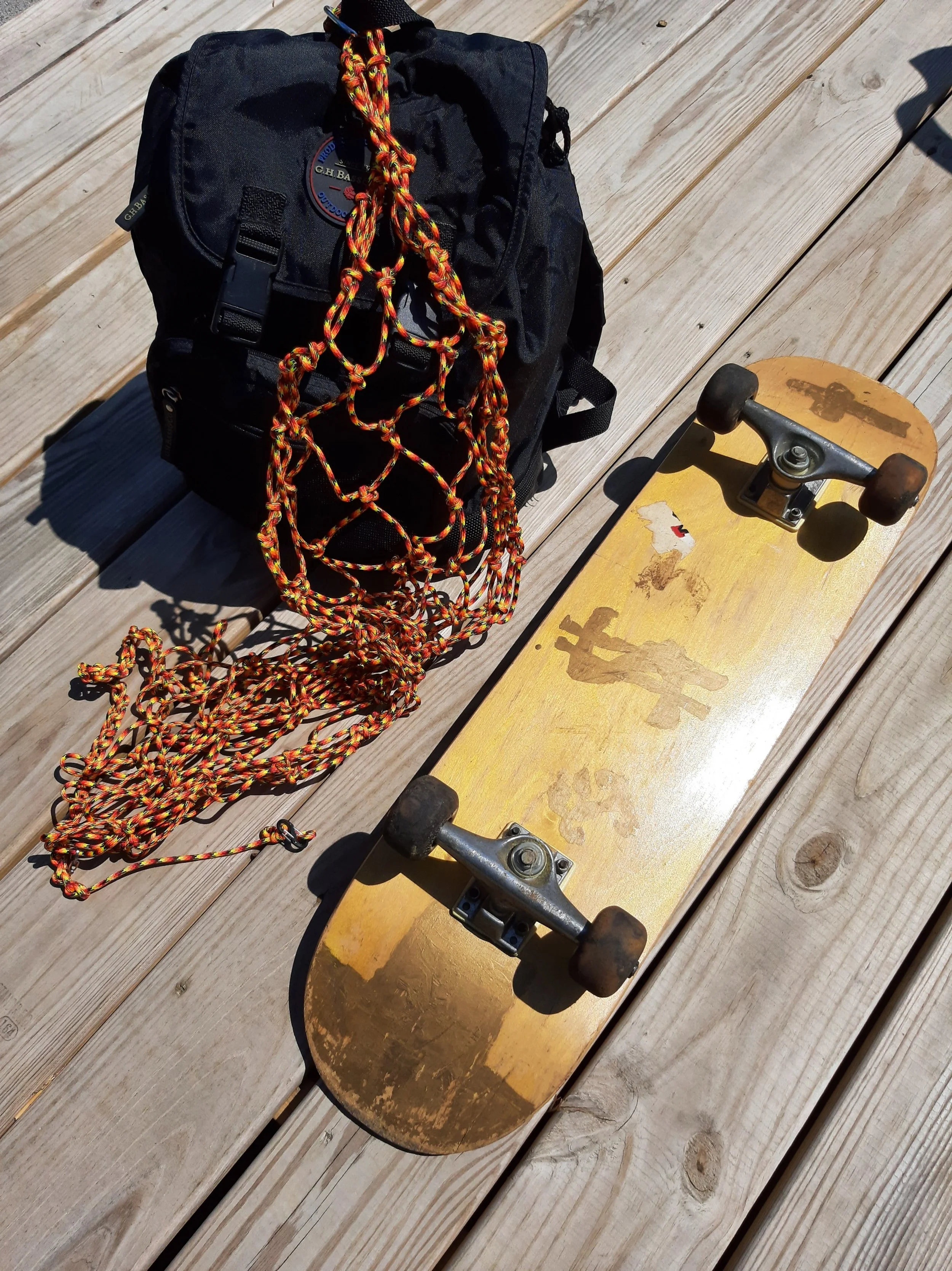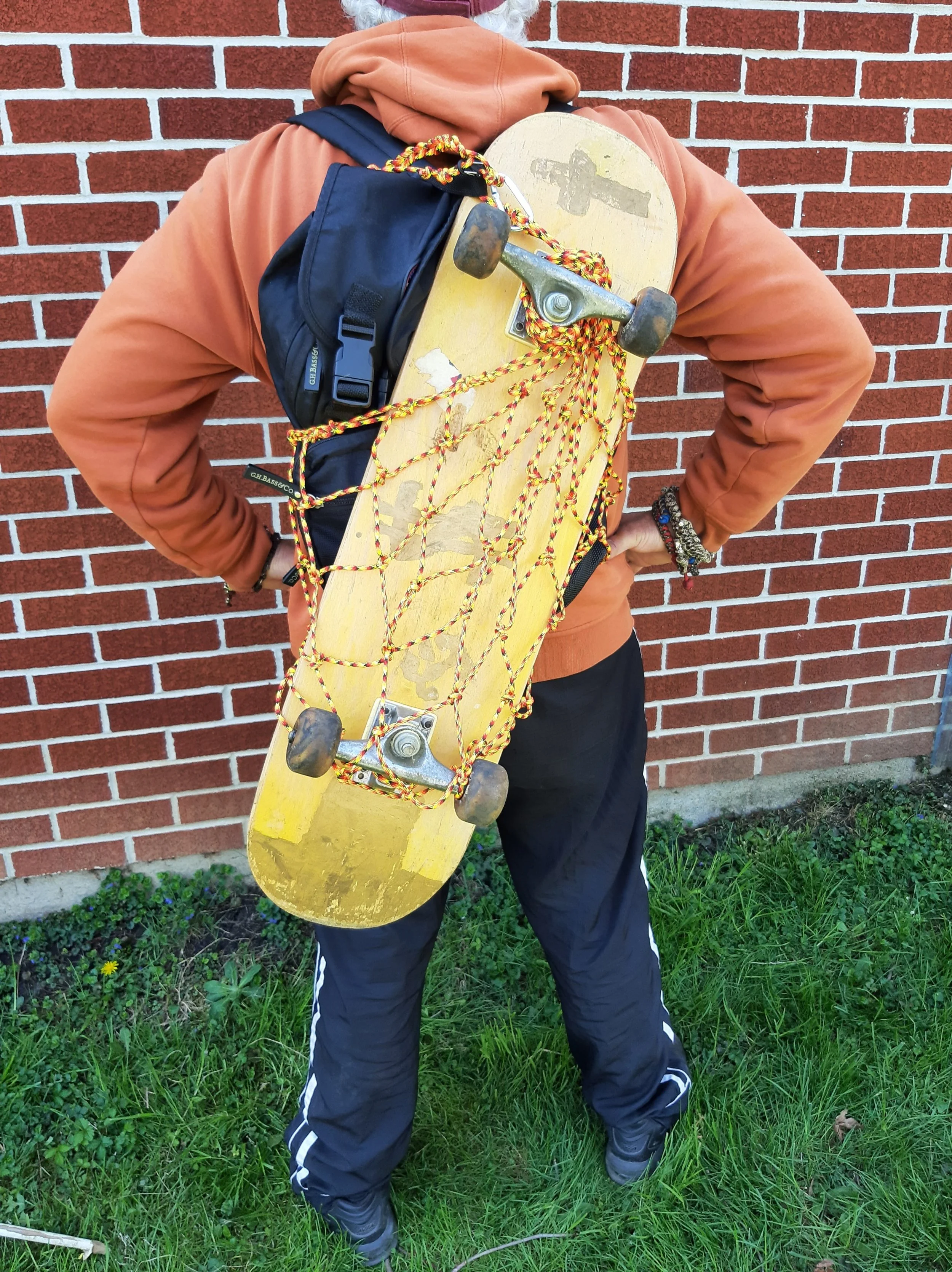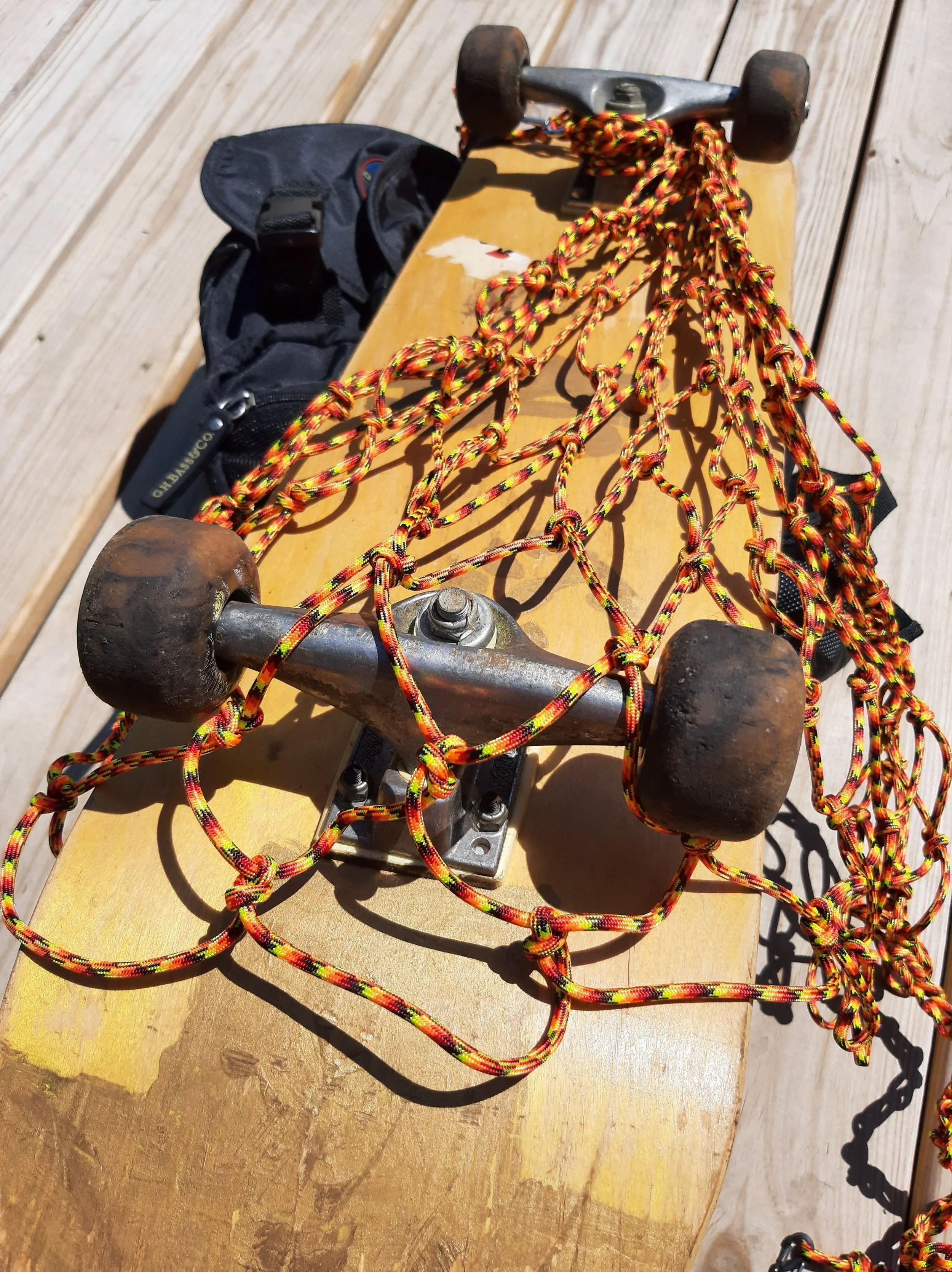 OK, the fixed end is clipped now. We take the long tail to weave thru a mesh on the bottom and come up and around the fixed end, grab a mesh, and repeat, joining both ends, keep in mind your skateboard is going to hang lower, and we are weaving around it. It’s supported by the wheels poking thru the mesh on the other side. Undo the long tail daisy chain if you need more tail to wrap cinch on a mesh when all is secure. The goal is to keep it tight up against the pack to keep it from swaying. Hope this helped, So go carry on and ride with the wind!